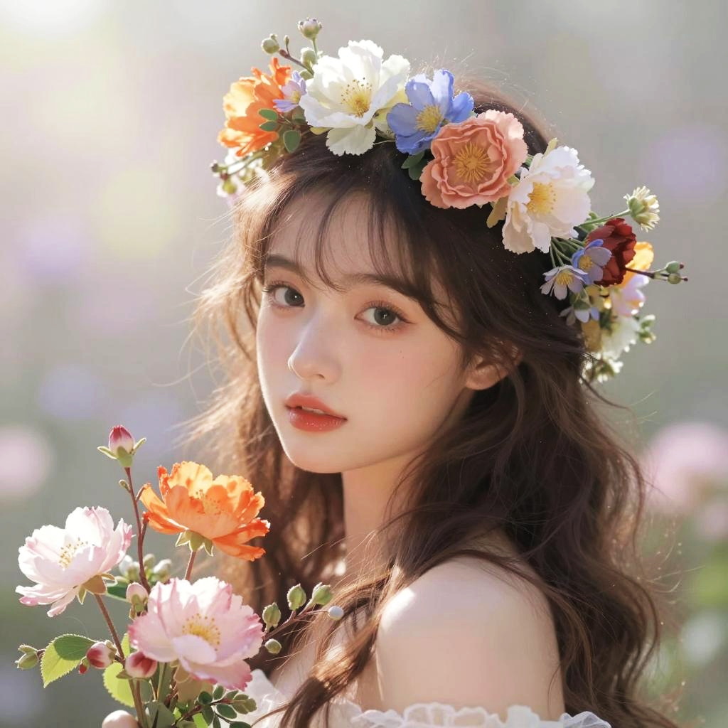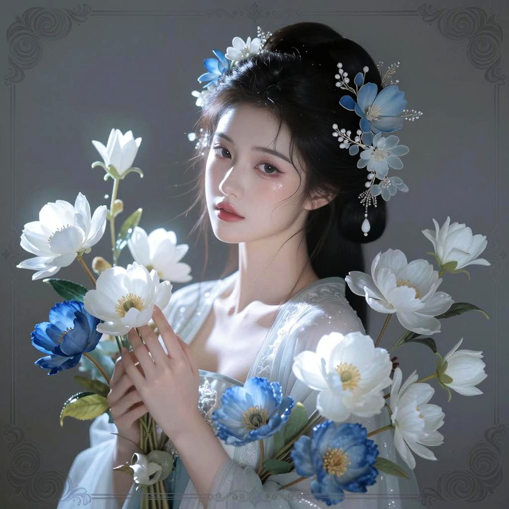 A digital artwork featuring a serene woman surrounded by an intricate arrangement of flowers in shades of white and blue, with a soft glow highlighting her delicate features. The composition combines fantasy and realism, emphasizing ethereal beauty and detailed floral elements framed by an ornate decorative border.