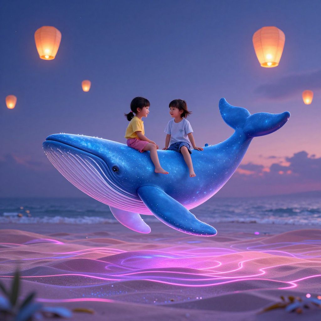 Two children perch atop a glowing blue whale, soaring through a dreamlike expanse where neon sands ripple beneath them and floating lanterns illuminate the twilight sky, evoking a sense of boundless wonder and the ephemeral beauty of childhood imagination.