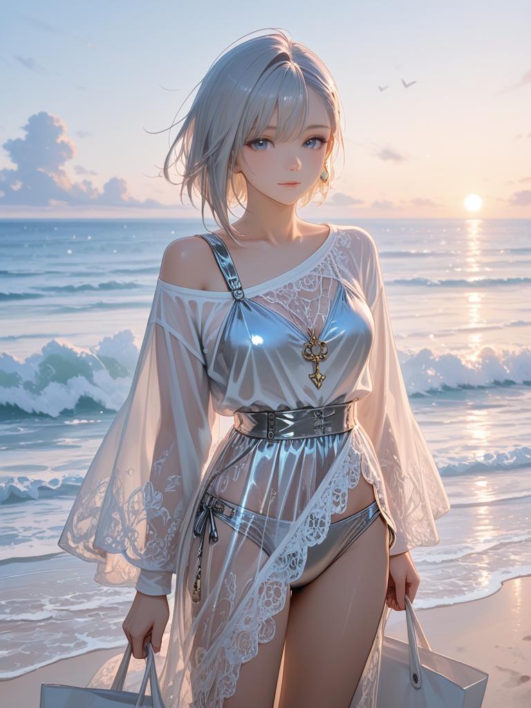 Portrait of a young woman with silver hair standing on a beach at sunset. She wears a metallic silver one-shoulder monokini with a high-waisted bikini bottom, layered with a sheer white mesh cover-up featuring intricate lace detailing and long sleeves. She holds an oversized navy blue canvas beach tote with leather straps. The ocean waves and soft sunlight create a serene atmosphere.