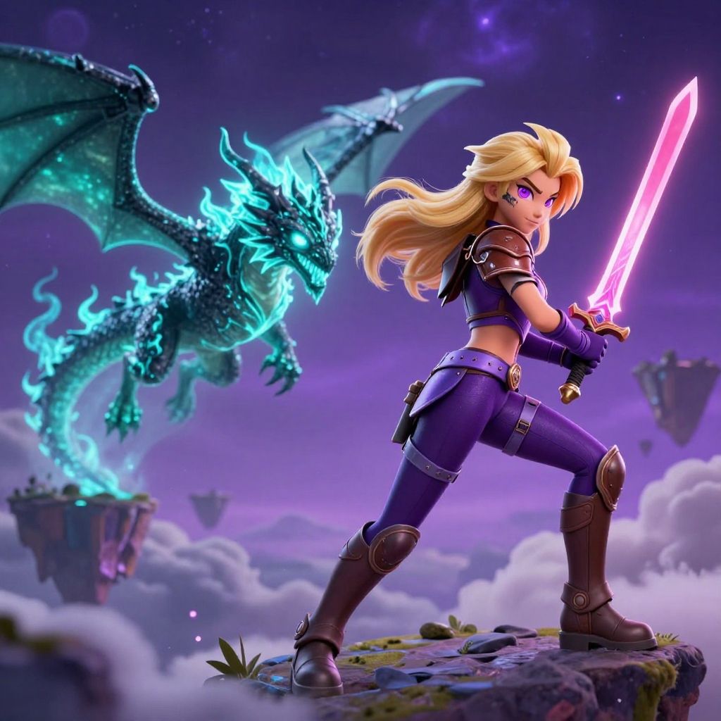 Digital fantasy artwork depicting a blonde, blue-eyed female warrior with long hair, holding a glowing pink sword. She wears a purple armored outfit with black accents, leather boots, and fingerless gloves, standing on a rocky cliff. Behind her, a large, blue, ethereal dragon with glowing, translucent wings and sharp teeth looms. The background features a starry, twilight sky with floating islands and scattered clouds. The warrior's confident stance and the dragon's intimidating presence create a dynamic, action-packed scene. The colors are vivid, with a strong contrast between the purple outfit and the blue dragon.