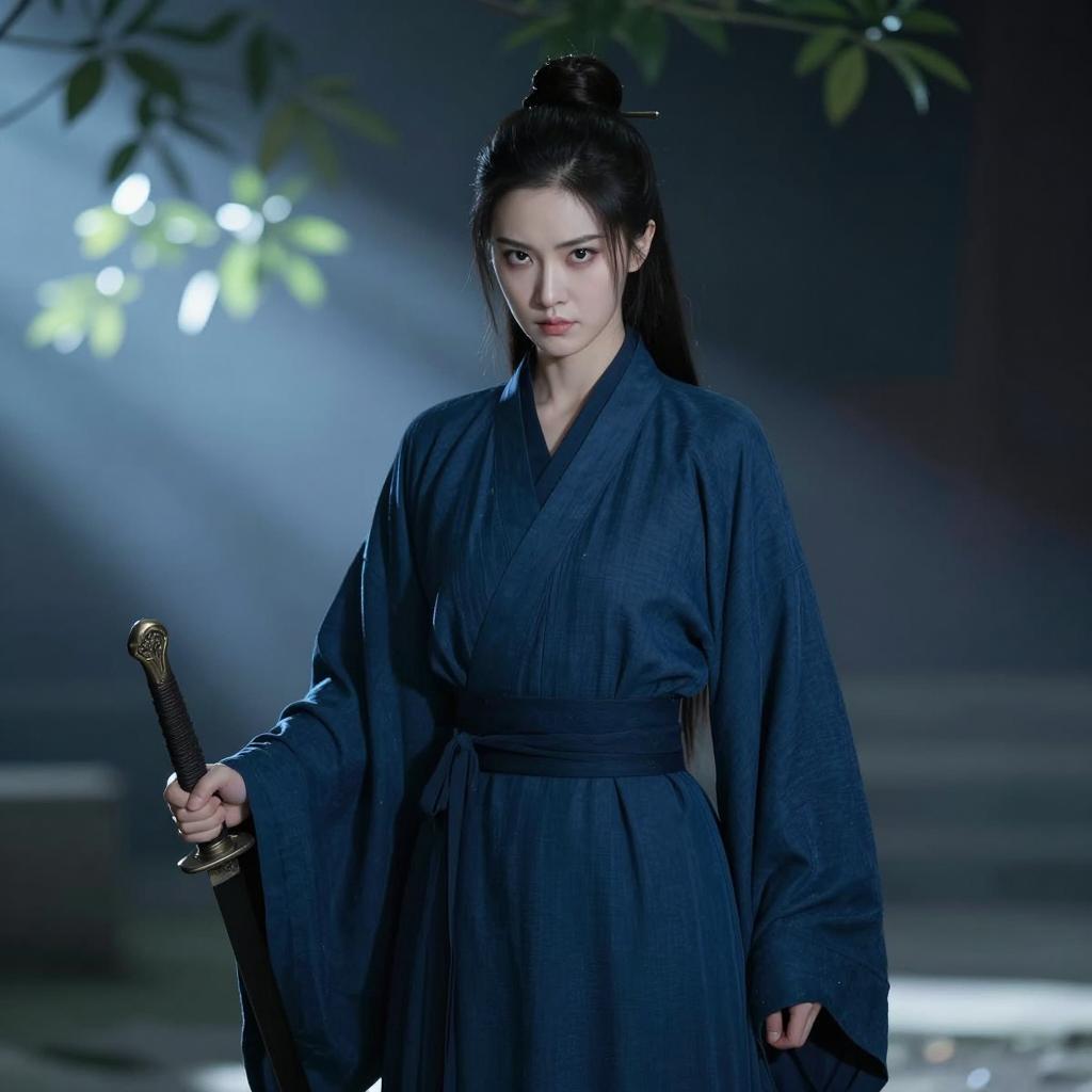 Studio photograph of an Asian woman with brown eyes and hair styled in a bun with a small braid. She stands in front of a dark patterned wallpaper background wearing a dark red dress with short sleeves, a black frilled skirt, and a wide black belt with two black leather pouches. She holds a sword with a wrapped handle horizontally across her shoulders with both hands, showing a serious expression.