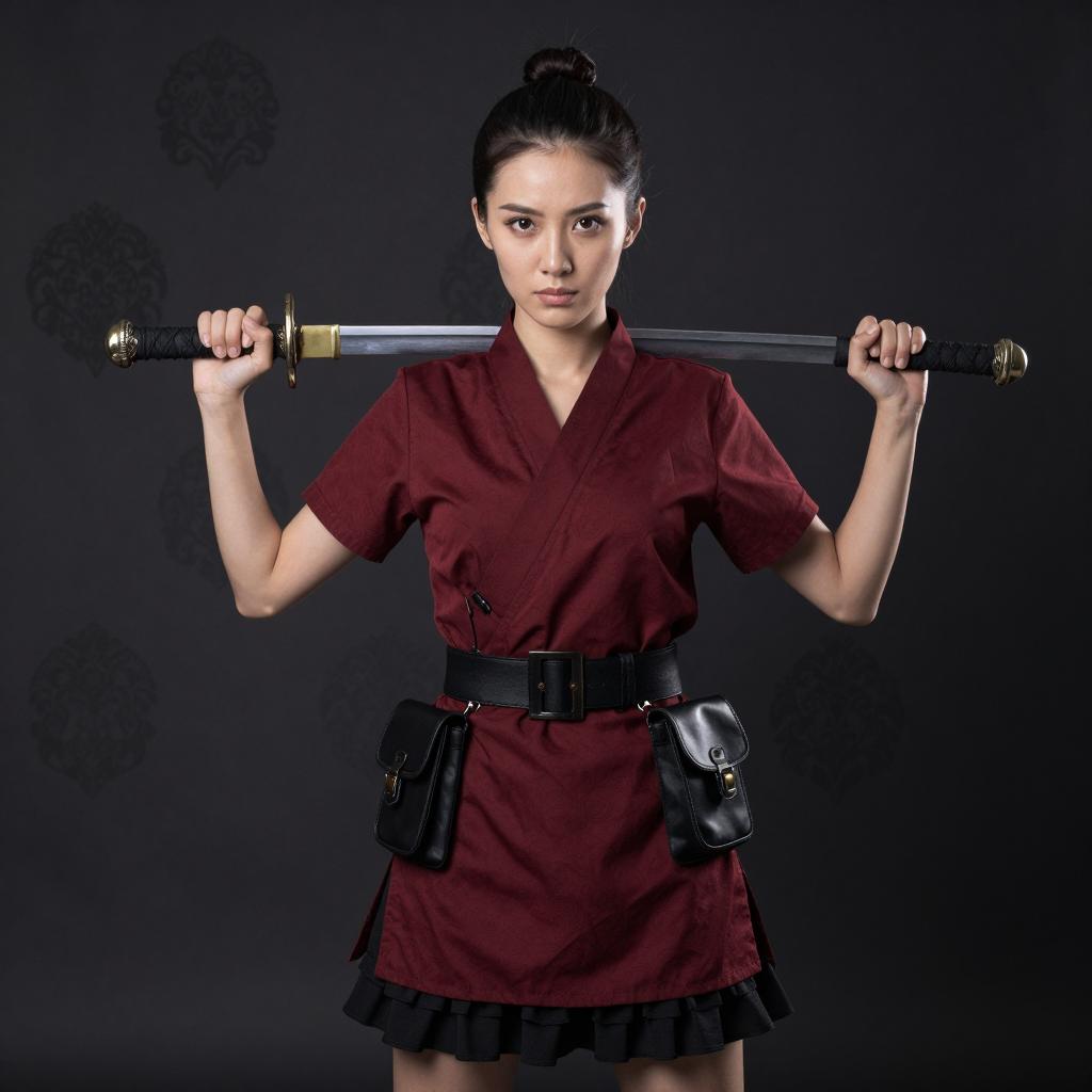 Asian woman in dark red dress with black belt and pouches, holding a sword with both hands across her shoulders. Background: dark patterned wallpaper. Hair in bun with small braid. Serious expression. Studio photograph. Vertical composition. Full body view. Standing position. Brown eyes. Short sleeves. Black frilled skirt. Sword has wrapped handle.