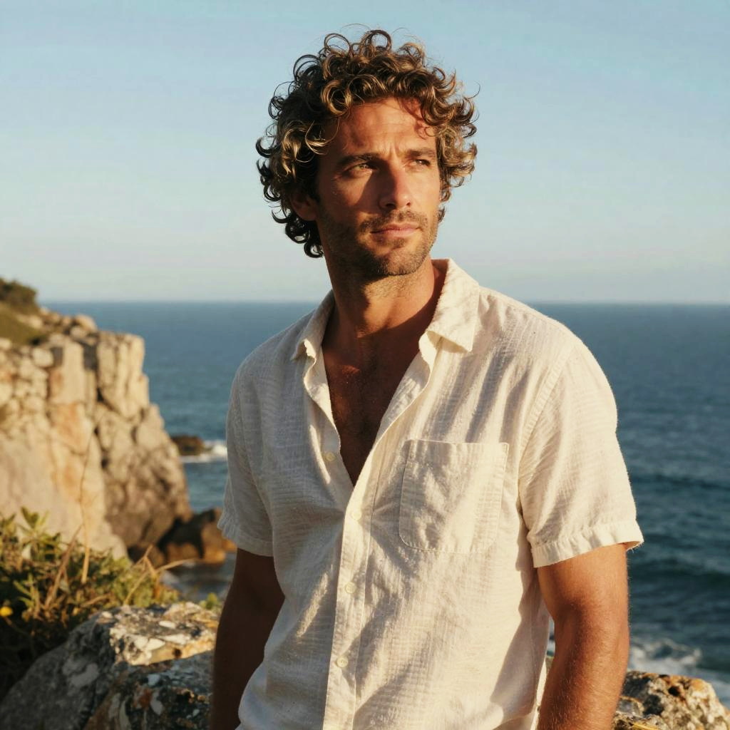 Warm nostalgic polaroid style portrait of an adult woman with curly strawberry blonde hair and light skin at sun-drenched vintage café patio with hanging plants, golden-hour rim light, soft breeze moving hair and fabric, confident relaxed pose, shallow depth of field, crisp clean color grading, natural highlights and gentle shadows, subtle film grain, storytelling composition, high detail, serene summertime mood.