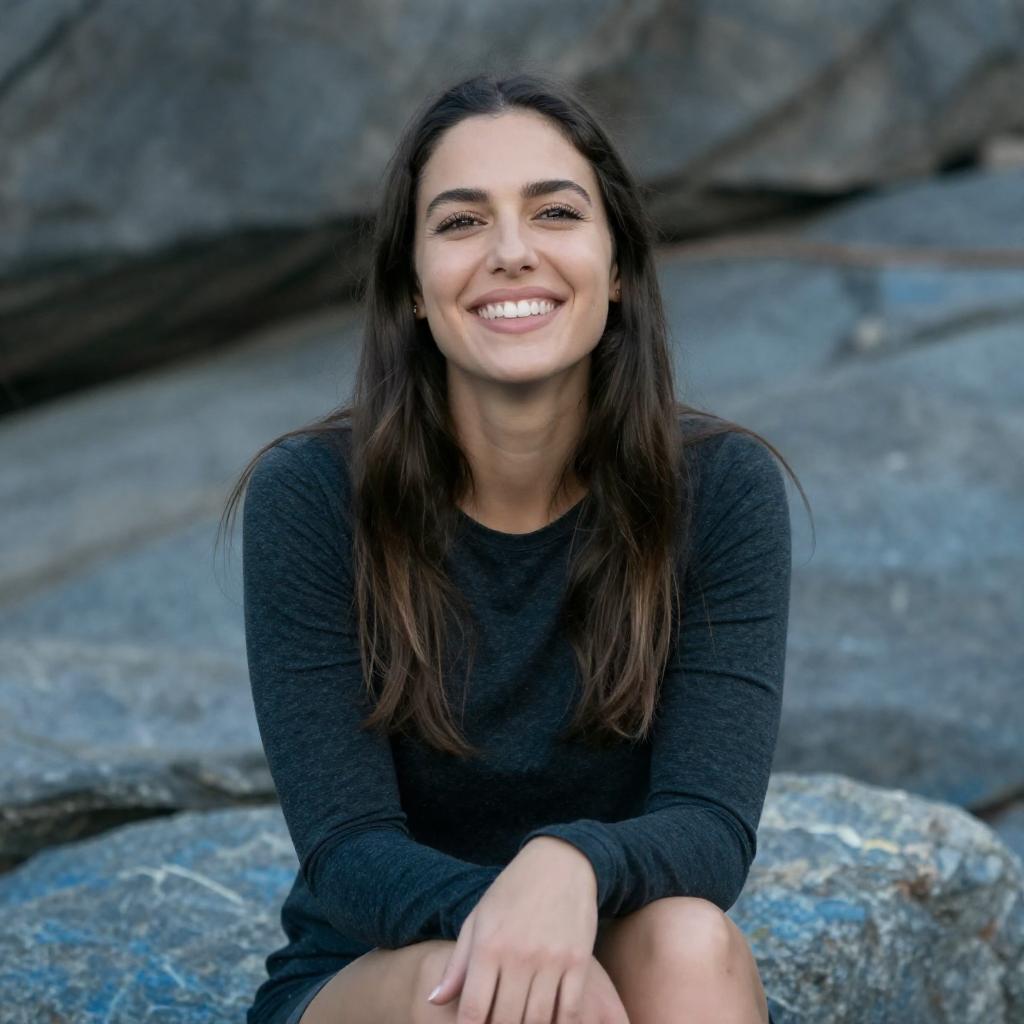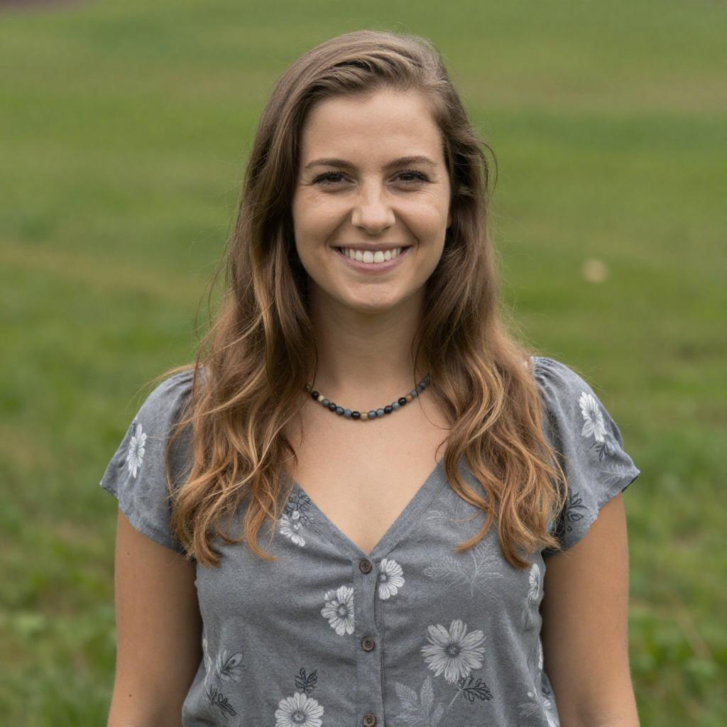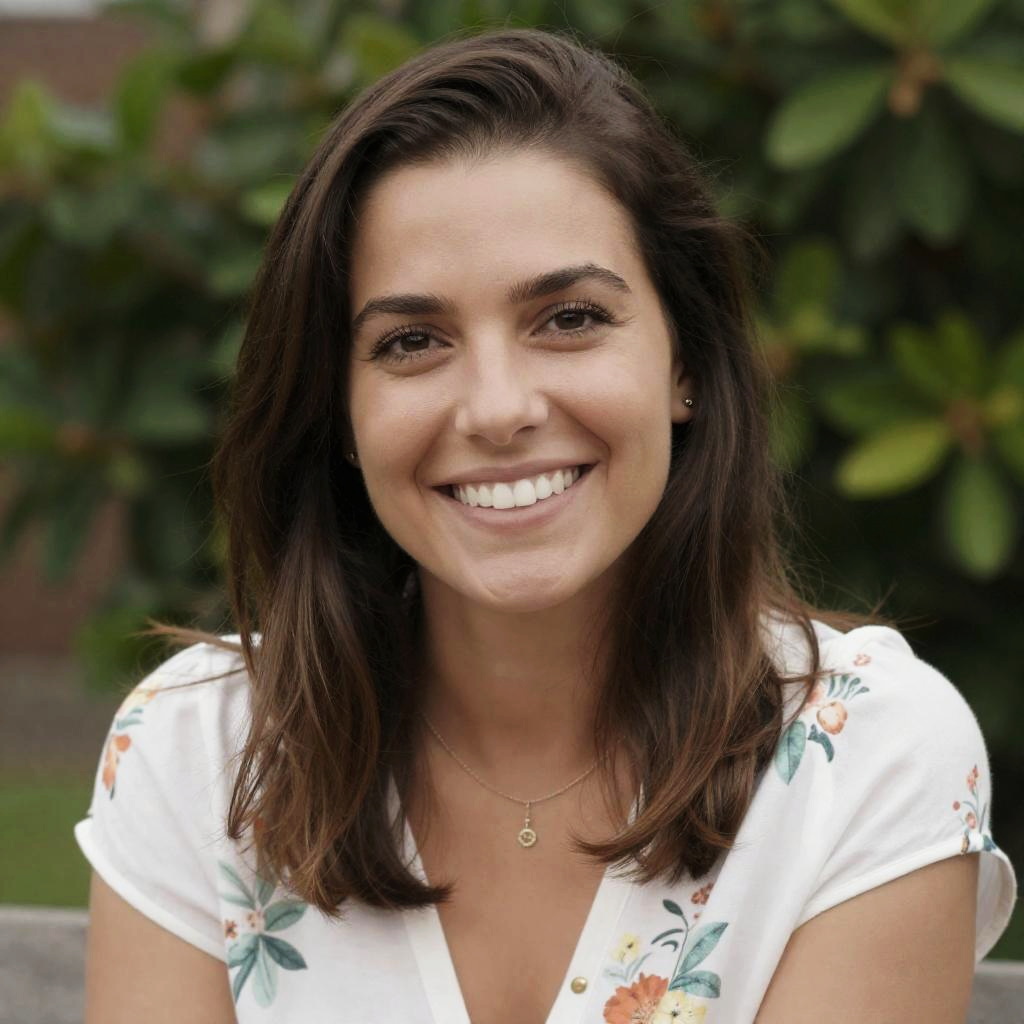 Portrait of a smiling young woman with fair skin and brown hair tied in a ponytail, wearing a black t-shirt, standing outdoors with blurred greenery in the background. Vibrant pink and purple flowers are softly in the foreground, adding color and depth to the image. The woman is looking directly at the camera, conveying warmth and friendliness.