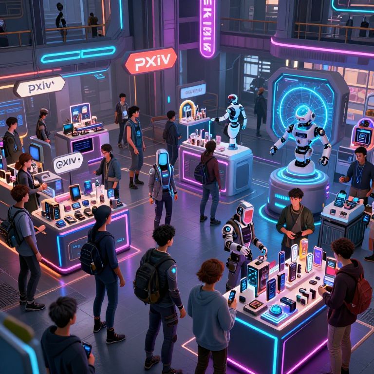 Pxiv futuristic marketplace scene, diverse crowd of cyber-enhanced individuals shopping amidst glowing stalls filled with high-tech gadgets, bustling atmosphere with vibrant neon signs and advanced robotic vendors, richly detailed environment