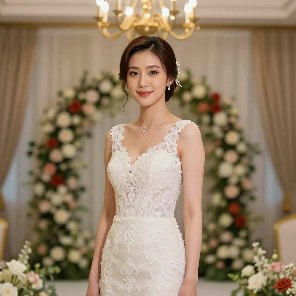 White evening dress weddings, photograph of an Asian bride in an elegant white lace wedding dress, standing in a luxurious room, looking directly at the camera, soft smile, dark hair in a loose updo, delicate jewelry, background with blurred floral arch, warm lighting, gold chandelier above, red and white flowers, ornate curtains, bridal gown with intricate lace patterns, sleeveless, elegant and romantic atmosphere, natural light, indoor setting, portrait orientation, shallow depth of field, soft focus