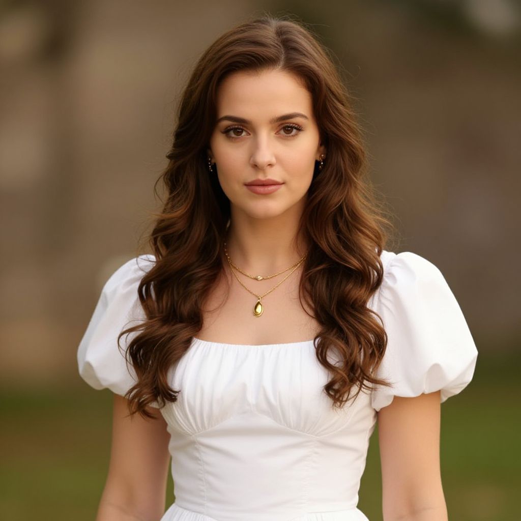 Woman goldilocks costume, 1girl, solo, jewelry, brown hair, long hair, necklace, dress, earrings, realistic, white dress, looking at viewer, curly hair, blurry background, lips, blurry