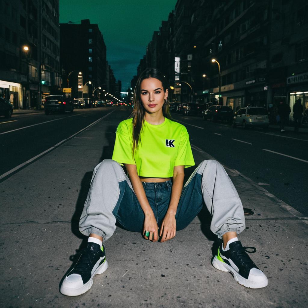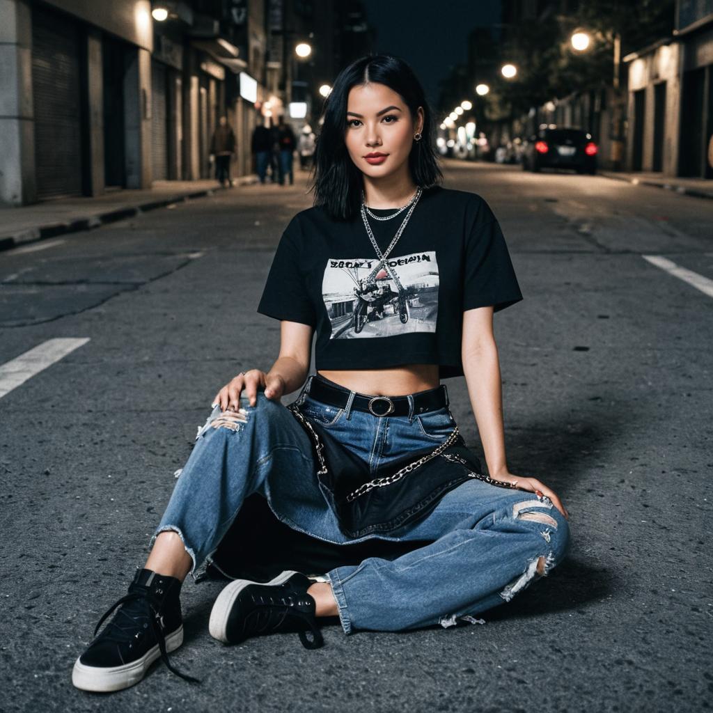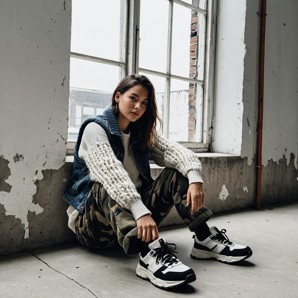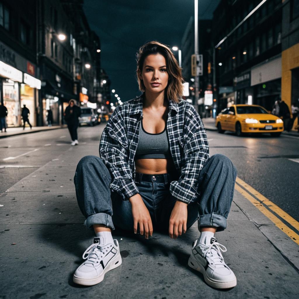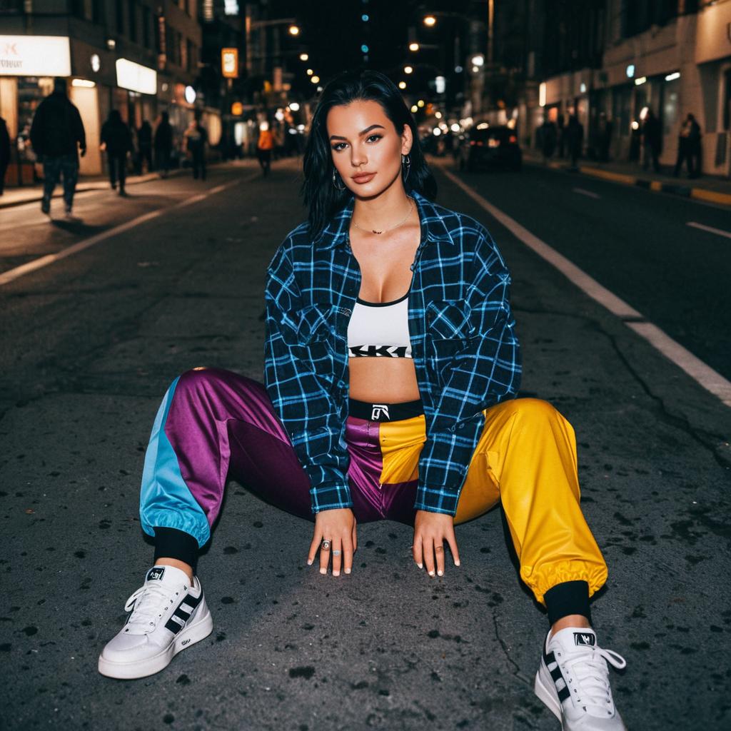 Low-rise Cargo Streetwear, full-body shot of a woman seated casually on rough concrete ground. She wears an oversized flannel shirt worn open over a sports bra paired with velvet bell-bottom trousers. The background is an abandoned subway tunnel with mercury lighting under soft overcast light. Y2K fashion, edgy street style, photorealistic, 8k, detailed denim and fabric textures.