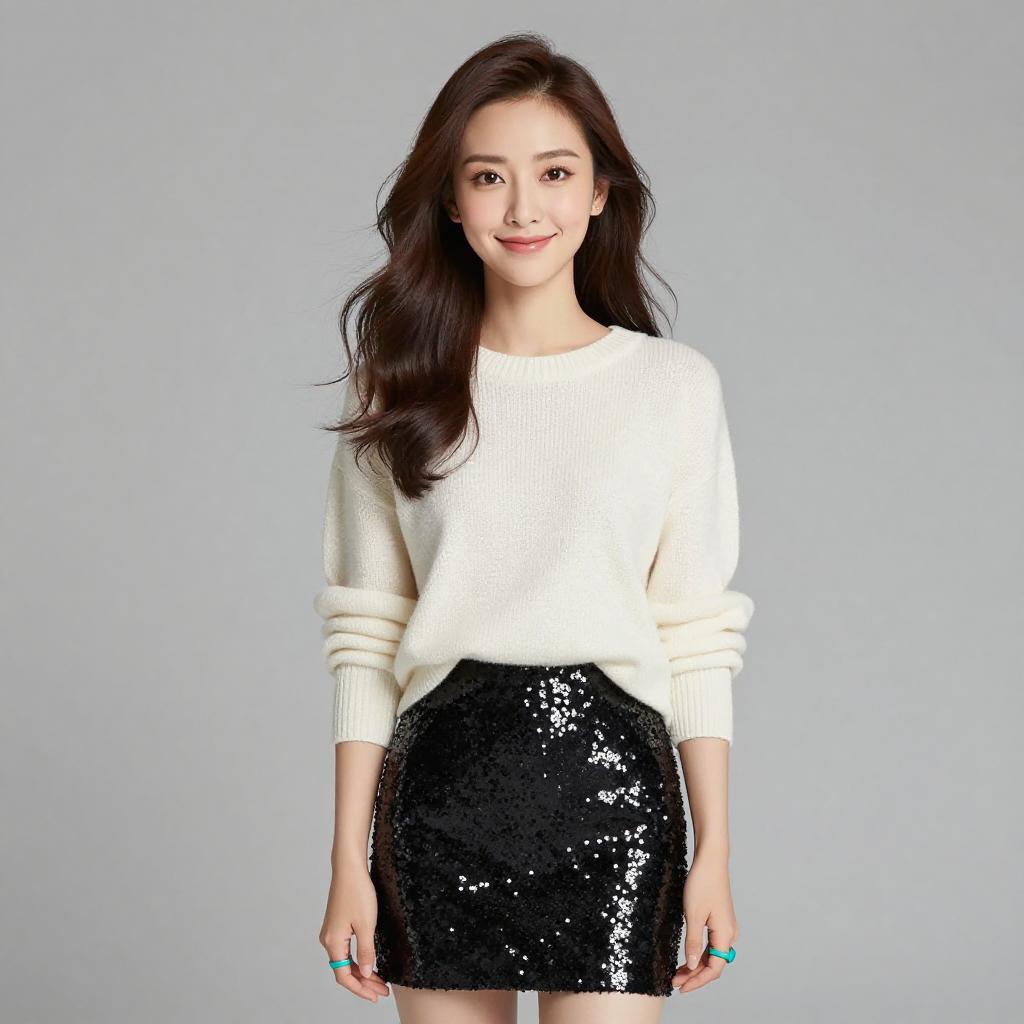 Woman with pretty face and pretty hair. smiling Woman, casual contemporary, sheer white top with short sleeves and a layered, slightly flared hem, paired with a textured pink mini skirt, minimalist style bracelet, natural makeup, and loose wavy hair, plain grey studio background. --sref 1467