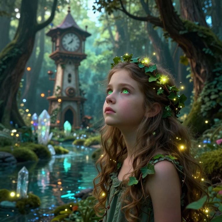 In a breathtakingly detailed and cinematic scene, a young girl with striking green eyes and a serene expression stands in a dense, mystical forest. Her hair, adorned with delicate ivy and glowing fireflies, is intertwined with the surrounding foliage, creating a sense of harmony with nature. The girl's face, illuminated by the soft, magical light filtering through the trees, exudes a sense of calm and wonder. The forest, rich in texture and depth, is bathed in a soft, ethereal glow, with the crystal-clear spring water reflecting the surrounding beauty. In the background, an old high tower with a curved clock face, stopped at 8, stands as a testament to a bygone era, its steampunk elements adding a touch of whimsy to the scene. The overall composition is a harmonious blend of natural and man-made elements, with the girl at the center, her presence both grounding and elevating the scene. The lighting, a blend of soft, warm tones and cool, neon hues, enhances the magical atmosphere, creating a sense of depth and dimension. The image captures a moment of quiet contemplation, where the girl's gaze, directed upwards, invites the viewer to join her in a journey of discovery and wonder.