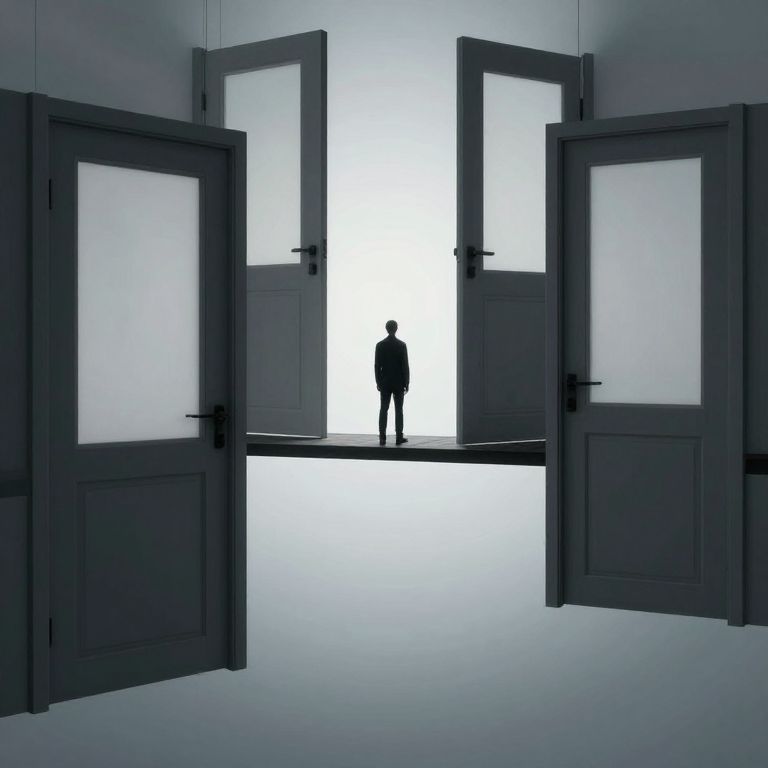 Suspended doors bridge the chasm between worlds, their hollow frames echoing the weight of choices left unmade, while a solitary figure stands at the edge, contemplating the void below—a poignant reminder of the precarious balance between hope and uncertainty.