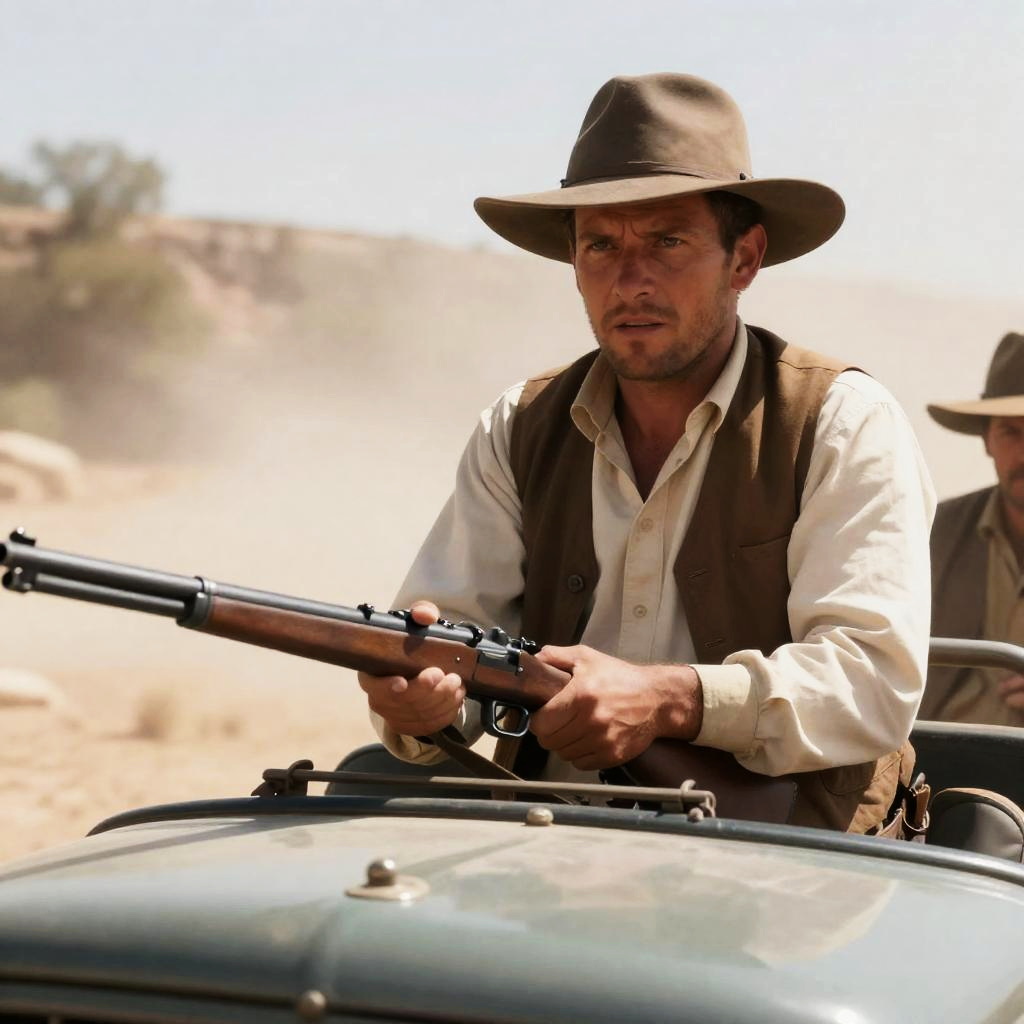 Photograph of a white man wearing a brown vest, white shirt, and wide-brimmed hat, gripping a rifle while seated on a vintage vehicle. He has an intense expression. The background shows dry, rocky desert terrain with dust clouds in the air, suggesting movement or action.