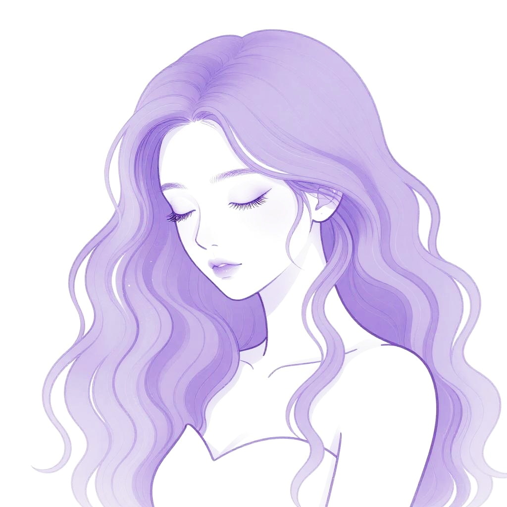 An ethereal beautiful woman with long soft wavy lavender hair, whimsical and angelic, thin line art, flat color illustration, high quality, eyes closed, with an ethereal and mystical lighting effect.