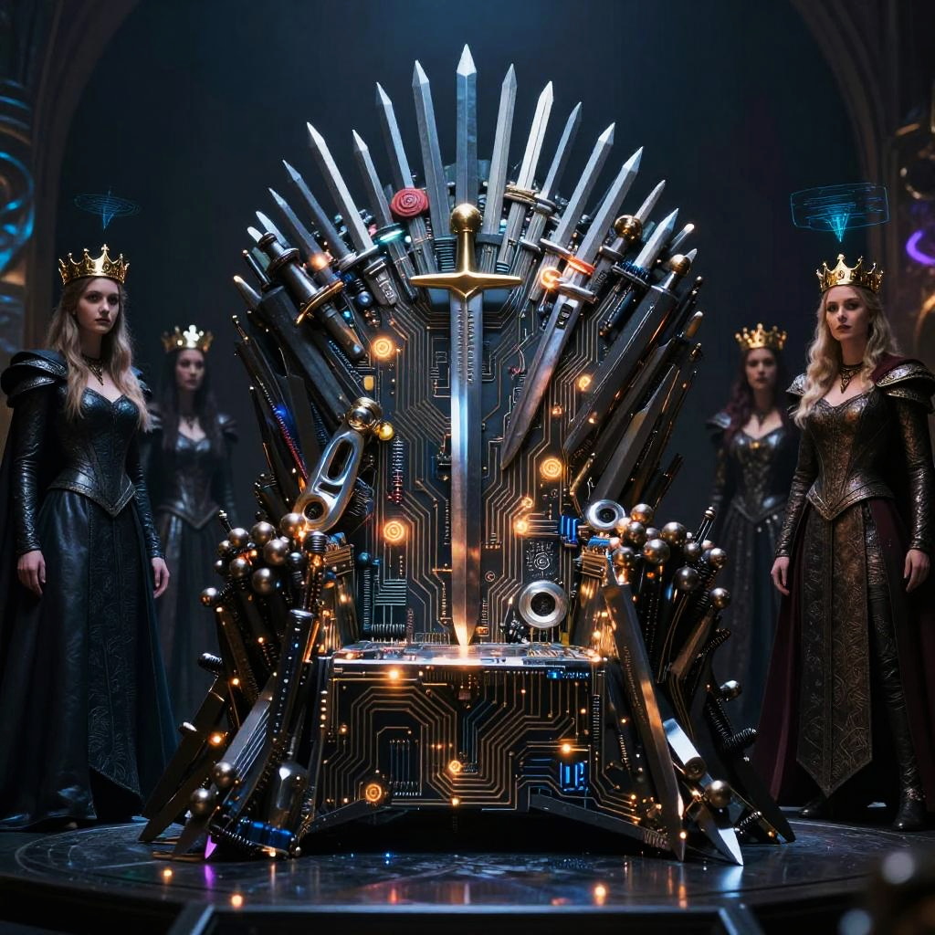 AI Game of Thrones, an imposing throne made of glowing circuit boards and swords, surrounded by AI kings and queens with holographic crowns, deep shadows and vibrant light effects creating a mysterious, high-tech medieval fantasy vibe