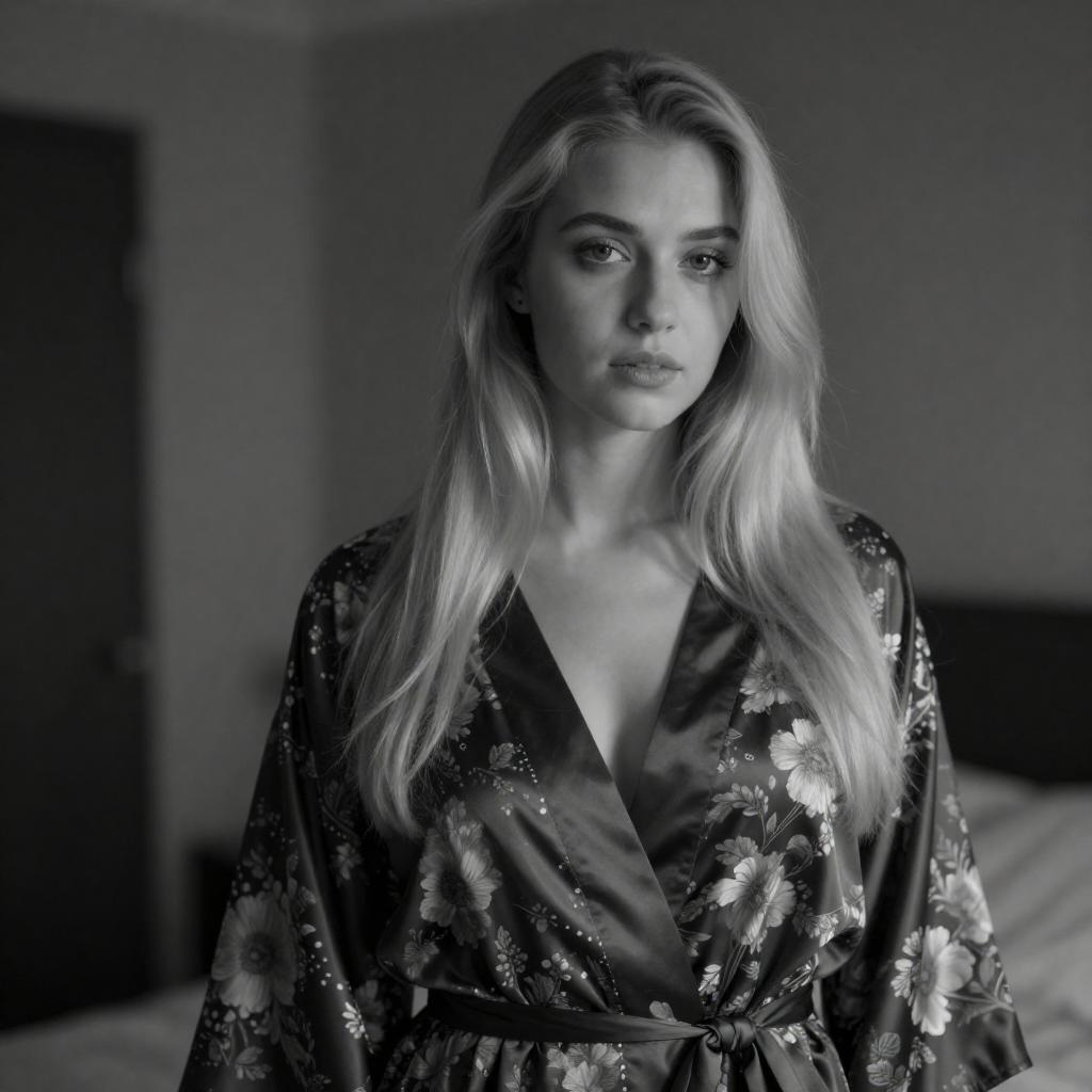 Black-and-white photograph of a young woman with long, straight blonde hair, wearing an ornate, light-colored, V-neck robe with floral embroidery. She stands indoors, slightly to the right, with a neutral expression. Soft light highlights her hair and robe. Background includes a blurred doorway and wall.