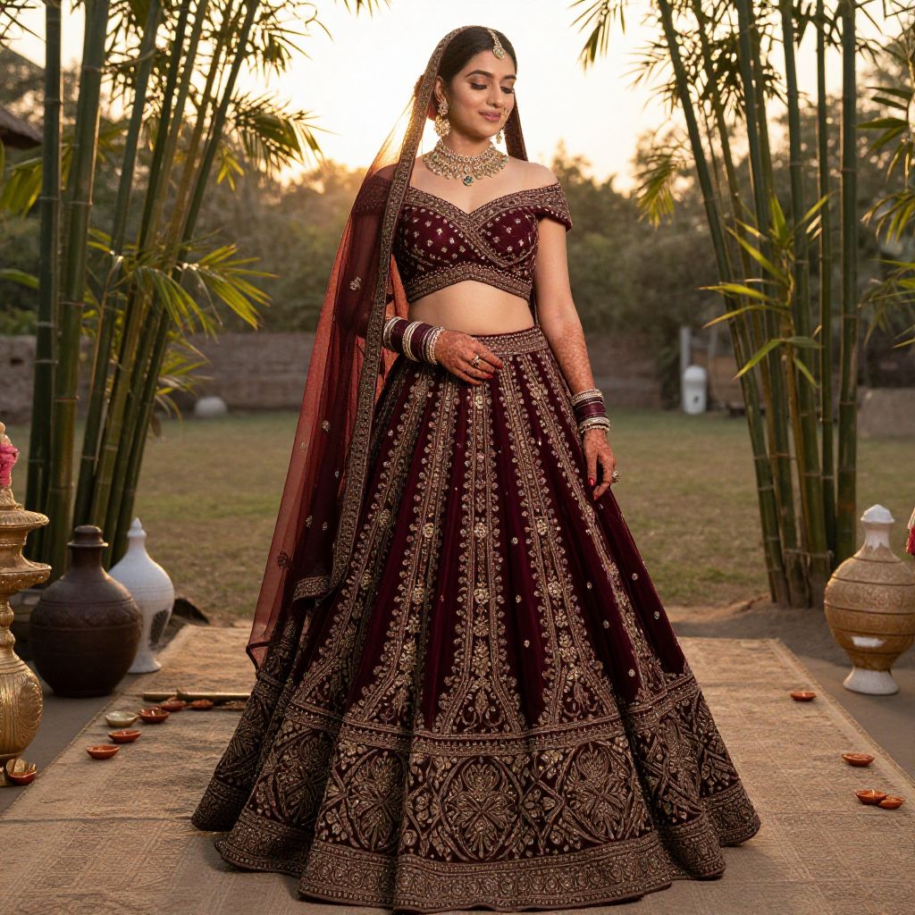 Photograph of a beautiful Indian woman in a dark maroon, gold-embroidered traditional lehenga, standing outdoors at sunset with bamboo and decorative