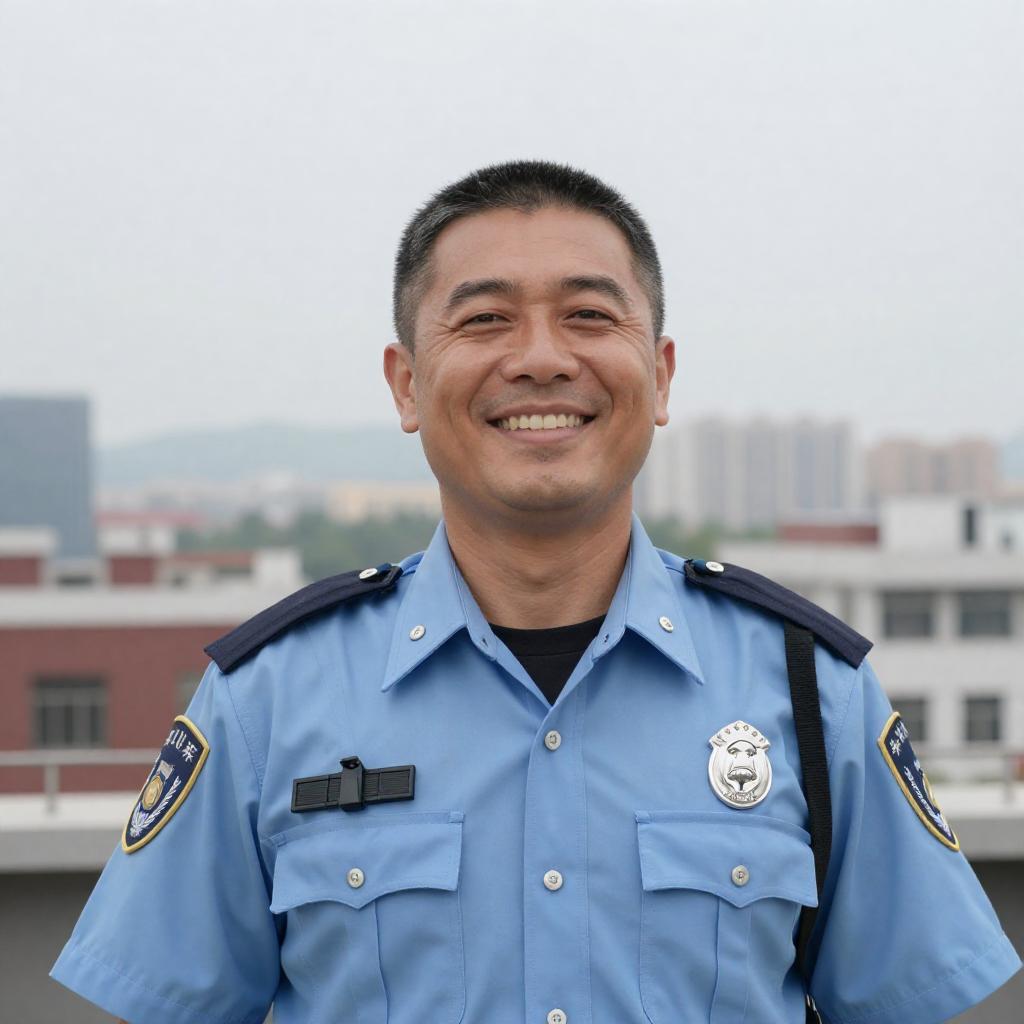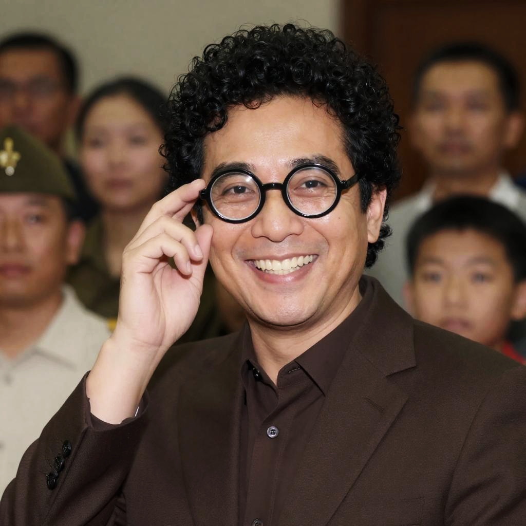 Middle-aged man with bald head and small topknot, wearing glasses, purple shirt, and gray pinstripe jacket, smiling slightly. Blurred green outdoor background. Badge with "M2" on his jacket's right shoulder. Close-up portrait.