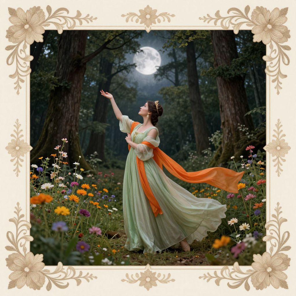 Enchanted forest scene framed by ornate floral borders depicts a woman in a flowing green gown, adorned with an orange sash, gracefully gesturing toward the moonlit backdrop while surrounded by vibrant wildflowers and towering trees.