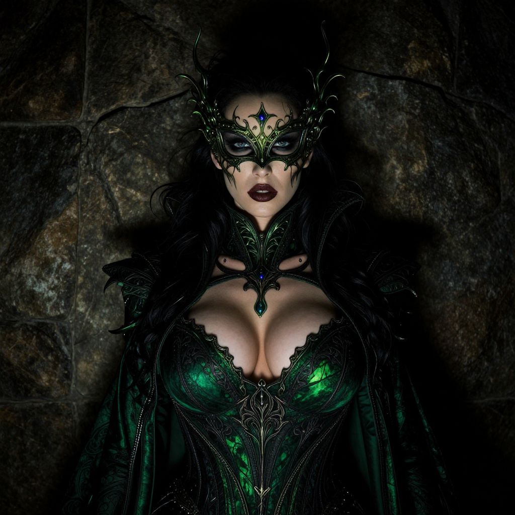 A woman in a green and black costume with a mask on her face, standing in front of a stone wall, big tits, sexy, detailed, dramatic lighting, dark and mysterious atmosphere, high resolution, cinematic style, eerie and enchanting, moody lighting, intricate costume design, dramatic shadows, mysterious ambiance, fantasy-themed, vivid colors, intense emotional expression, dark fantasy atmosphere, cinematic composition, dramatic intensity, intricate facial features, mysterious presence, haunting beauty, dark and brooding mood, intense visual impact, detailed textures, realistic lighting, dramatic contrasts, cinematic quality, dark and mysterious tone, elegant and sinister, high-definition, surreal atmosphere, intense emotional depth, dark and mysterious ambiance, mysterious and enigmatic, dark and dramatic setting, intricate costume details, hauntingly beautiful, intense visual drama, dark and mysterious mood, dramatic and intense, mysterious and enigmatic, dark and brooding, intense and dramatic, cinematic and atmospheric, dark and mysterious atmosphere, intense and dramatic, mysterious and enigmatic, dark and brooding, intense and dramatic, cinematic and atmospheric, dark and mysterious atmosphere, intense and dramatic, mysterious and enigmatic, dark and brooding, intense and dramatic, cinematic and atmospheric, dark and mysterious atmosphere, intense and dramatic, mysterious and enigmatic, dark and brooding, intense and dramatic, cinematic and atmospheric.