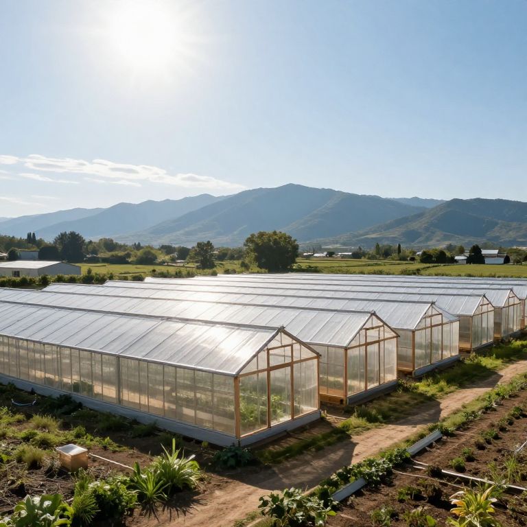 Photograph of a sunlit greenhouse farm set against a backdrop of blue sky and distant rolling hills. The greenhouse has multiple rectangular, glass-paneled structures with silver metal roofs, arranged in rows. The foreground shows raised garden beds with various green plants and soil. The mid-ground features additional farmland and scattered trees. The bright sunlight creates strong shadows, highlighting the greenhouse's clear glass and metallic roof. The overall scene is vibrant and serene, capturing the intersection of agricultural production and natural beauty.
