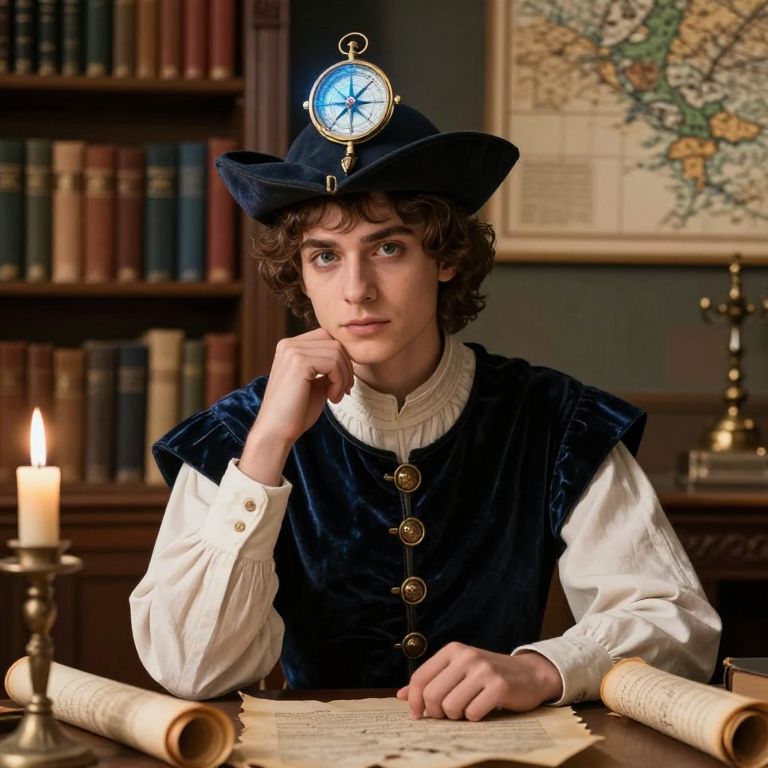 Photorealistic image of a young scholar in her 20s with sharp, intelligent eyes and a thoughtful expression, wearing a modern medieval outfit featuring a structured doublet, a velvet waistcoat, and a pointed hat with a glowing compass-like device on top, seated at a bookshelf in a candlelit library with ancient scrolls and open maps