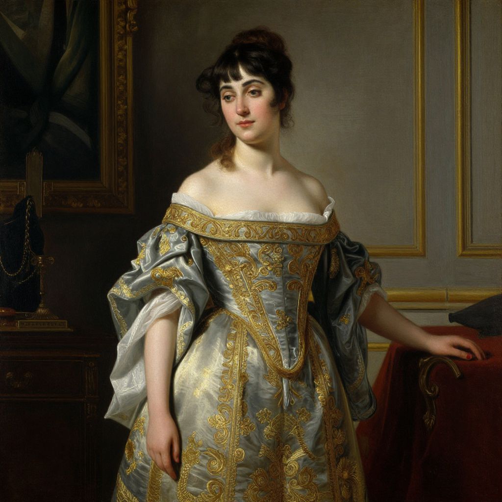 Baroque portrait of a fair-skinned woman in an ornate, silver and gold embroidered gown, with dark hair and red lips, standing in a
