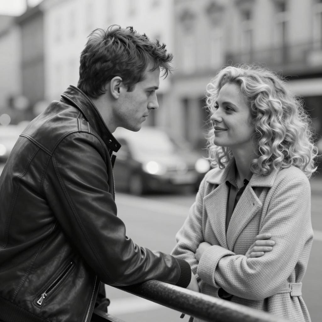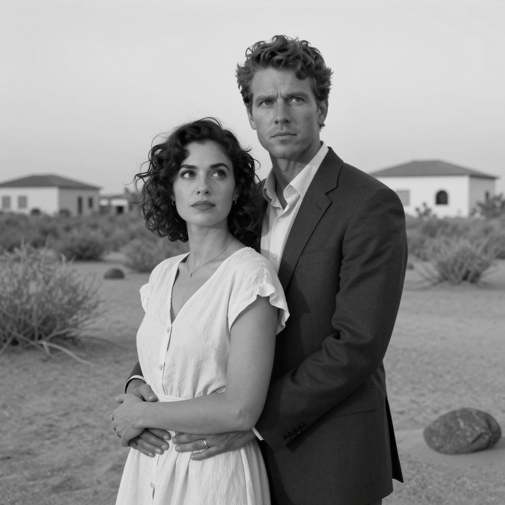 Black and white photograph of a man and woman leaning over a wooden railing. Man wears a hat and dark jacket, woman in checkered shirt and dark dress. Both look ahead. Man's hand on railing, woman's hand gripping her dress.