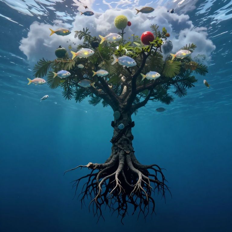 Photograph of an underwater tree with vibrant fish swimming among its green leaves and colorful fruits, illuminated by sunlight filtering through the blue water.