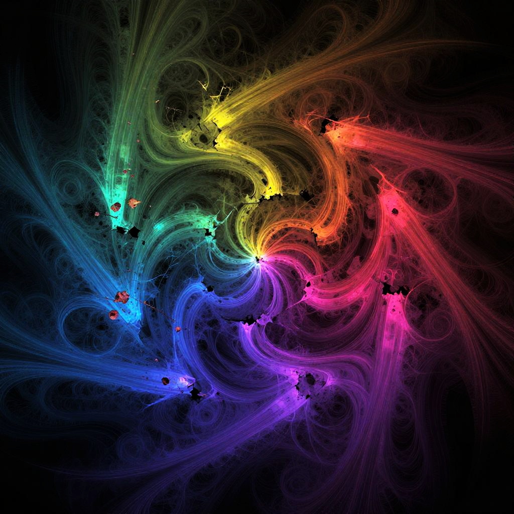 Unstable diffusion of vibrant colors swirling chaotically across a dark, abstract background, with sharp fractal patterns breaking apart, glowing edges, and a sense of motion and tension in a futuristic digital art style.