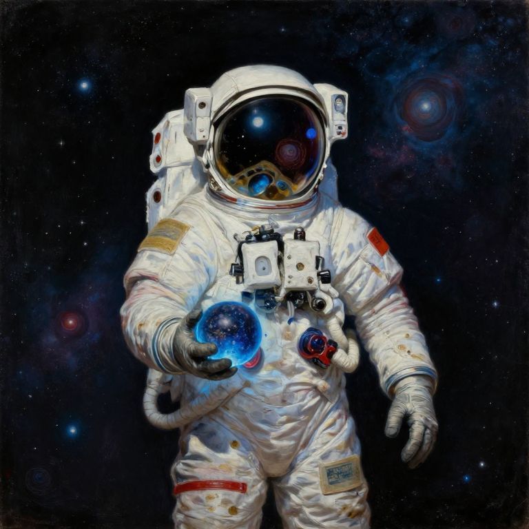Digital artwork of an astronaut in a white spacesuit holding a glowing blue orb, against a dark, starry space background.