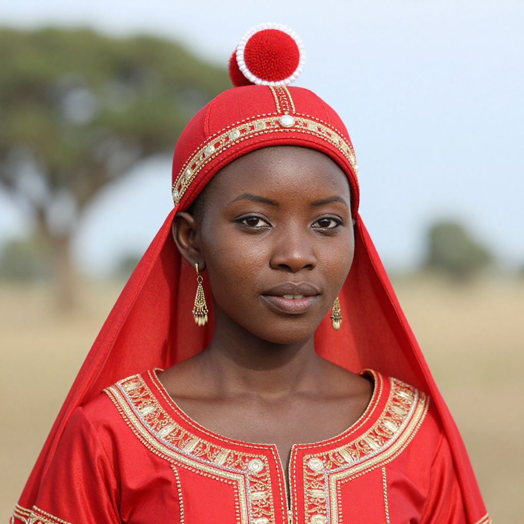 Photograph of a young African woman with dark skin, wearing a red traditional dress and headscarf with gold embroidery, and a red pom-pom