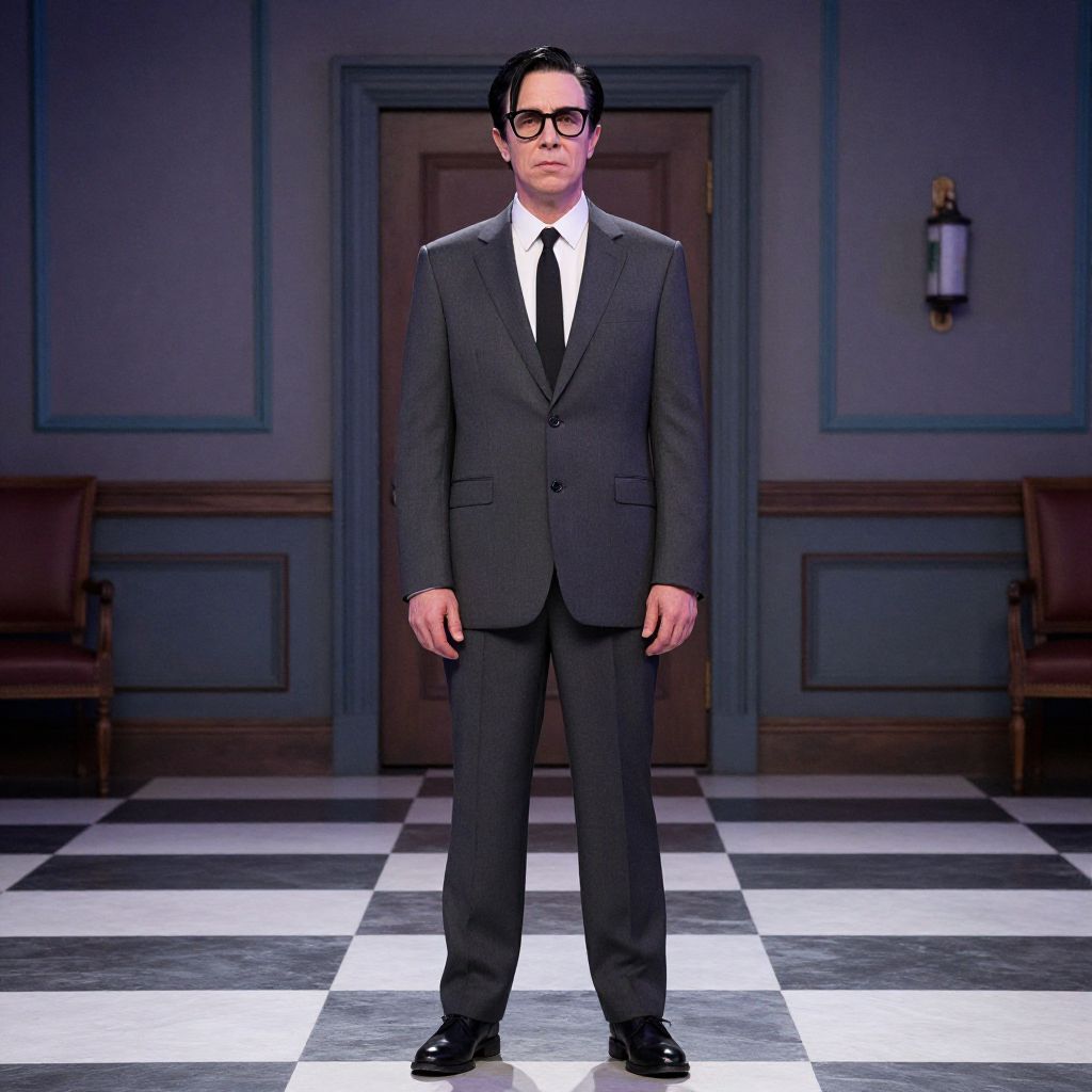 Photograph of a man standing in a dimly lit room with checkered black and white floor tiles. He has dark hair, wears black-rimmed glasses, and is dressed in a sharp, dark gray suit with a white dress shirt and black tie. His black shoes are polished. The background features a wooden door with a brass handle, framed by blue-gray paneled walls, and two brown leather armchairs on either side. A wall sconce with a frosted glass shade is visible to the right of the door. The man's expression is neutral, and he stands with his hands by his sides.
