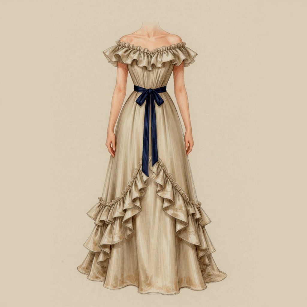 Digital illustration of an off-shoulder, cream-colored, ruffled gown with a navy blue ribbon belt, featuring layered frills at the hem,