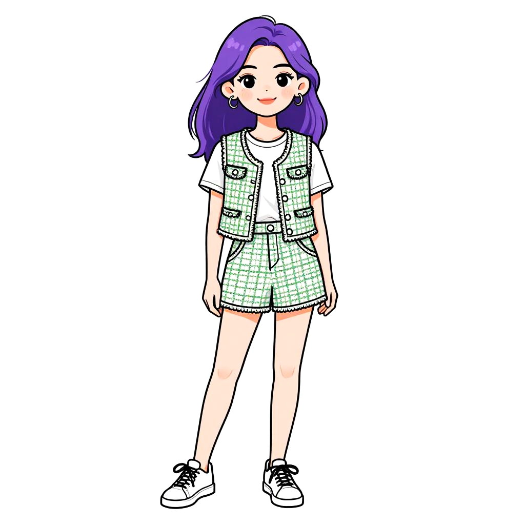 Digital anime-style drawing of a smiling young woman with purple hair, wearing a green checkered vest, white shirt, and matching shorts, with white sneakers