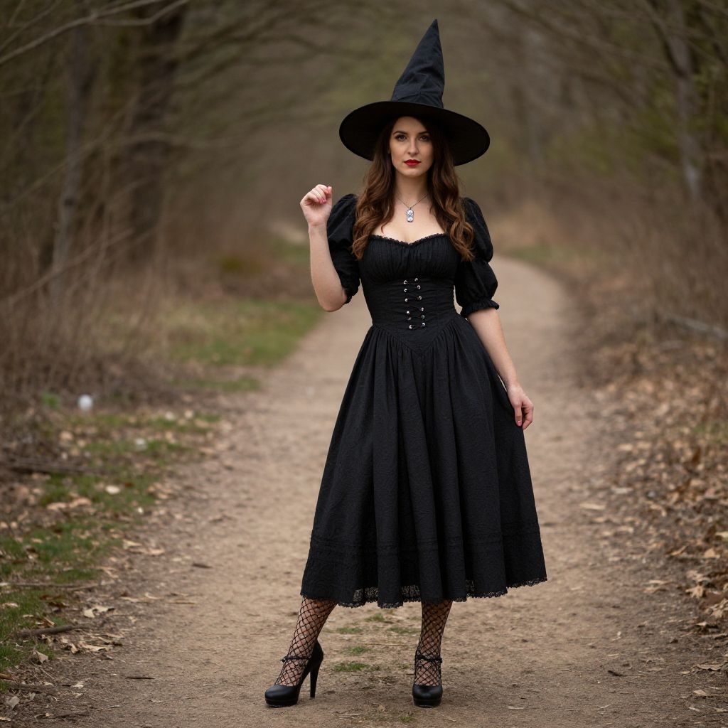 Retro Witch Costume, woman in black dress and hat standing on dirt path