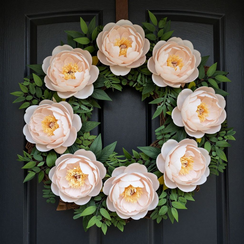 Circular wreath crafted with six artificial peony flowers in soft blush hues, interspersed with lush green foliage, designed as elegant front door decor for spring or holiday celebrations.