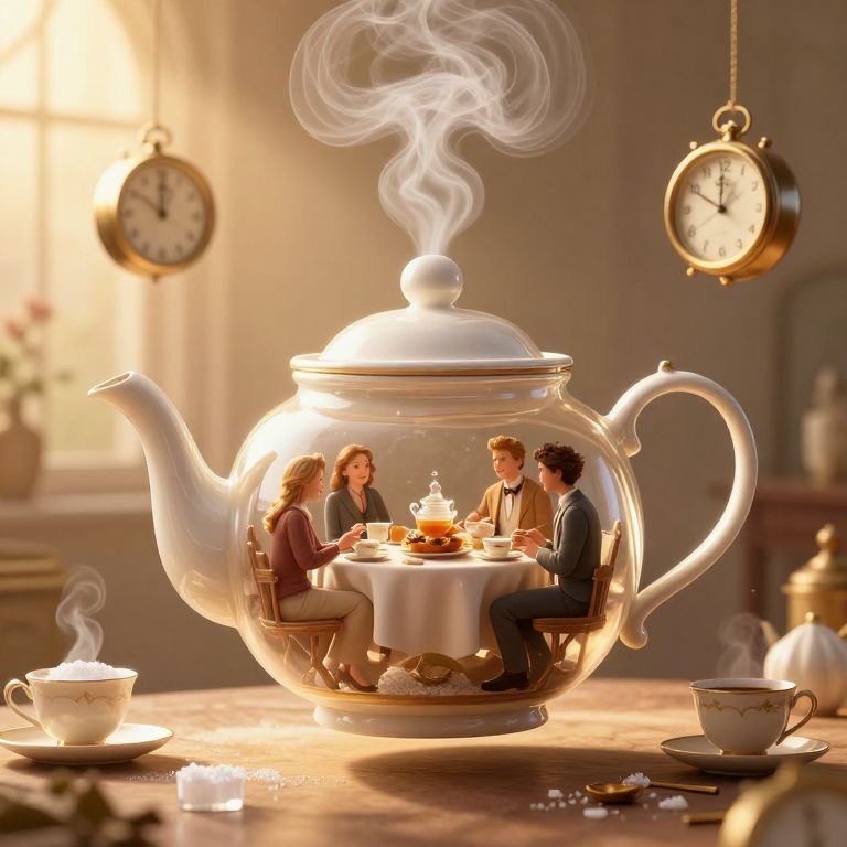 In a surreal, computer-generated fantasy scene, a whimsical tea party unfolds inside a floating teapot, illuminated by golden-hour lighting, as sentient steam swirls above and sugar clocks tick away, blending the boundaries between reality and imagination.