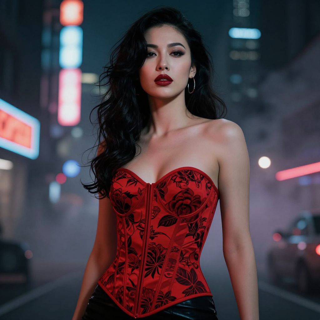 Photograph of an Asian woman with black wavy hair, wearing a red, strapless, floral corset, standing in a neon-lit,