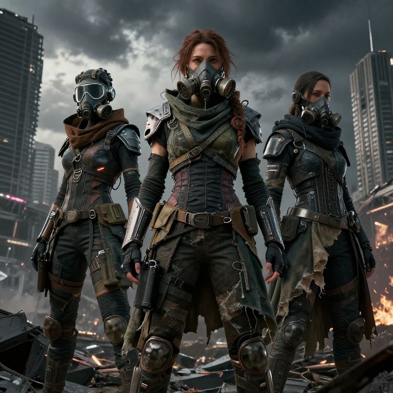 Female dystopian outfits featuring rugged and futuristic designs, worn by survivors in a post-apocalyptic cityscape, with layered armor, tattered fabrics, gas masks, and glowing neon elements, surrounded by ruined skyscrapers under a dark, stormy sky.