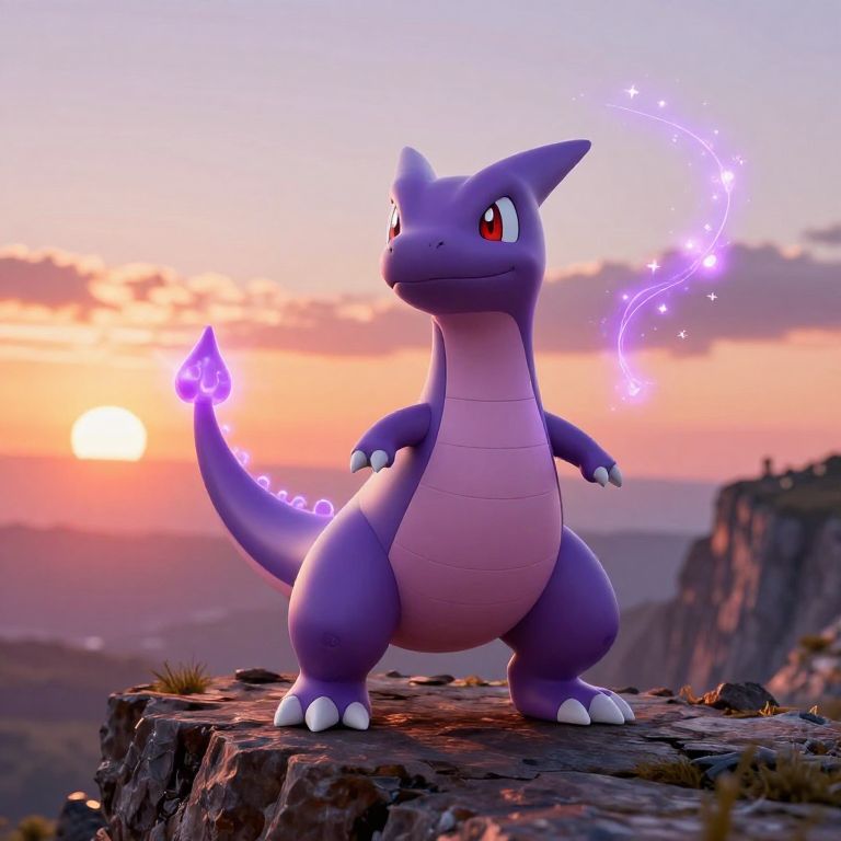 Purple dinosaur Pokemon standing majestically on a rocky cliff at sunset, glowing vibrant purple scales, playful eyes, surrounded by sparkling mystical aura, fantasy landscape