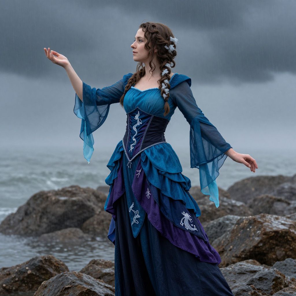 Photograph of a young woman with fair skin and curly brown hair, adorned with white floral hairpins, standing on rocky shore under a stormy, overcast sky. She wears a blue and black, Victorian-style dress with ruffled sleeves, intricate white embroidery, and layered, translucent blue fabric. Her right arm is extended upward, while her left arm is slightly out to the side, evoking a sense of magic or enchantment. The ocean waves crash gently in the background, adding a moody, dramatic atmosphere to the scene.