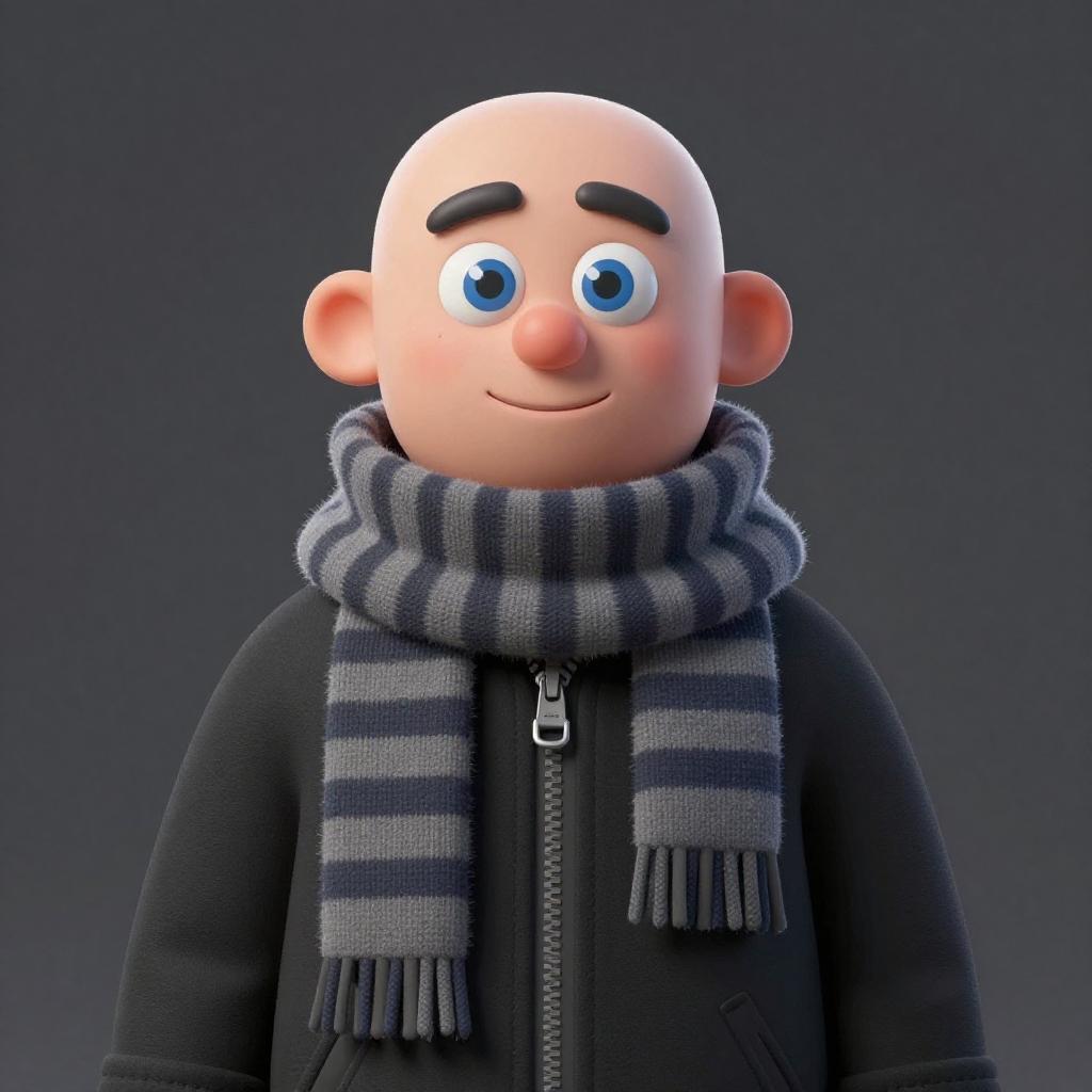 This is a digital 3D illustration of a bald man with a round face and blue eyes, smiling slightly. He's wearing a black coat with a gray and navy striped scarf wrapped around his neck. The background is a solid dark gray, making the character stand out. The coat has a zipper that's partially visible. The illustration has a cartoonish, slightly exaggerated style.