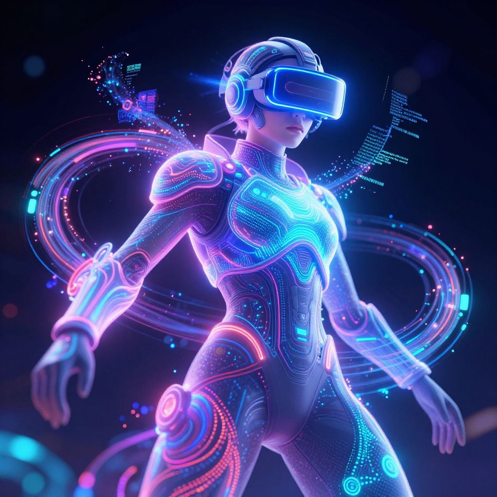 Dynamic AI cover character in a virtual reality space, wearing futuristic suit integrated with augmented reality gear, vibrant neon colors and electric patterns swirling around, digital avatar composed of light particles and code fragments, symbolizing fusion of human and AI intelligence.