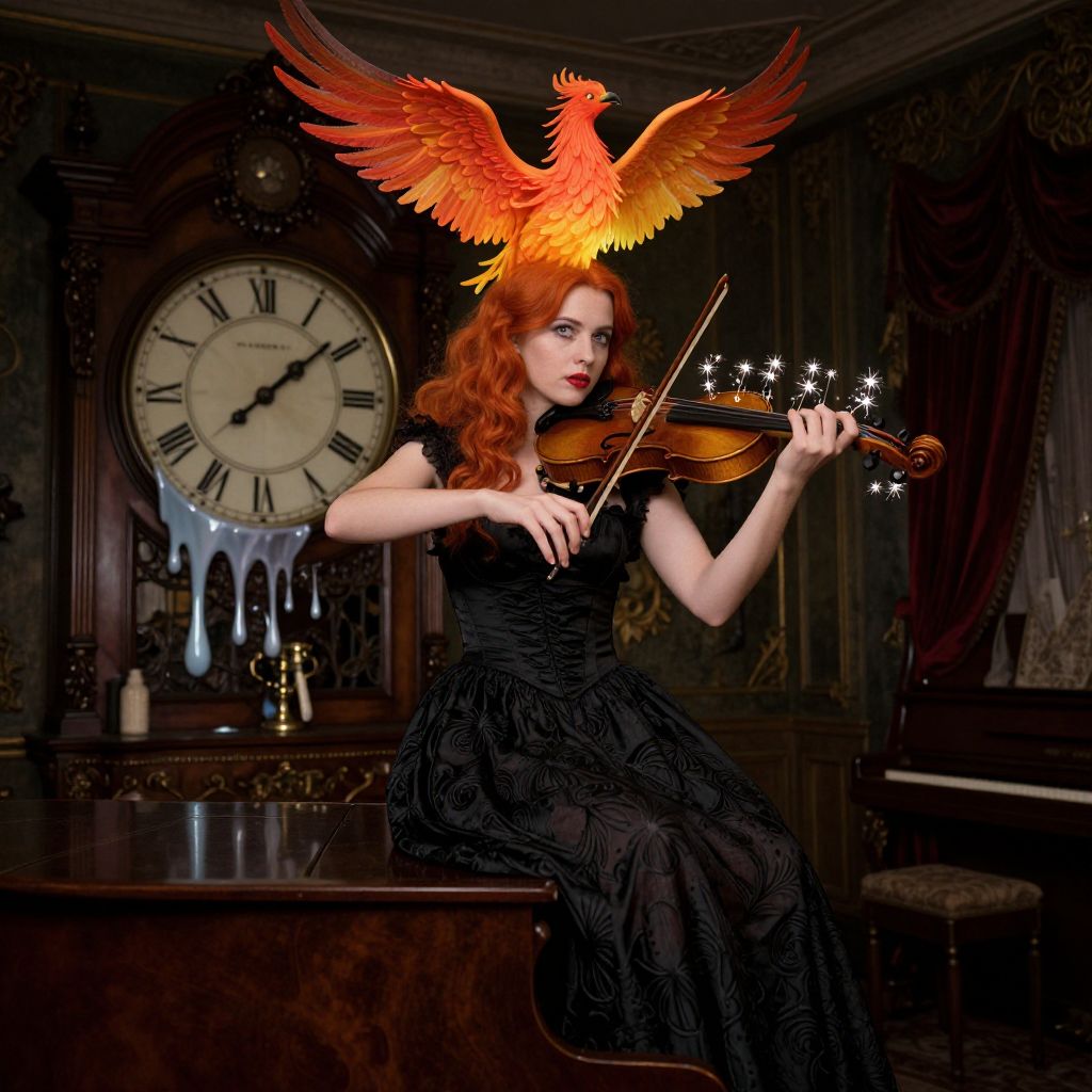 Imagine an entrancing portrait, reminiscent of surrealism, where a woman with vibrant red hair sits atop a grand piano within the shadows of a Victorian parlor. Her gaze is both mesmerizing and enigmatic as she plays a haunting melody on her violin, strings of light seemingly dancing around her fingers. The background showcases a large clock face melting into the furniture, contributing to the dreamlike atmosphere, while from the top of her head emerges a vibrant phoenix, symbolizing rebirth and transformation, creating an emotional gradient that evokes both nostalgia and hope in this enigmatic visual tableau.