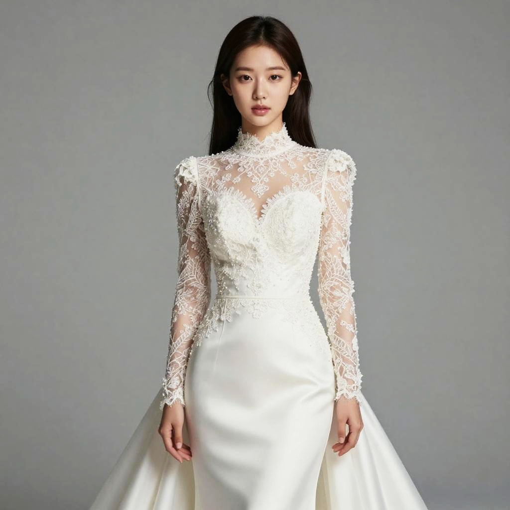 Photograph of an East Asian woman with long black hair standing against a plain gray background. She wears a white, long-sleeved wedding dress with intricate lace detailing on the bodice and sleeves, extending to a high, sheer neckline. The lace has floral patterns, adding a delicate texture to the dress. The lower part of the dress is satin, creating a smooth, flowing skirt that contrasts with the lace. Her expression is neutral, and she stands facing the camera directly, with her arms relaxed by her sides. The lighting is even, highlighting the dress's textures and colors.