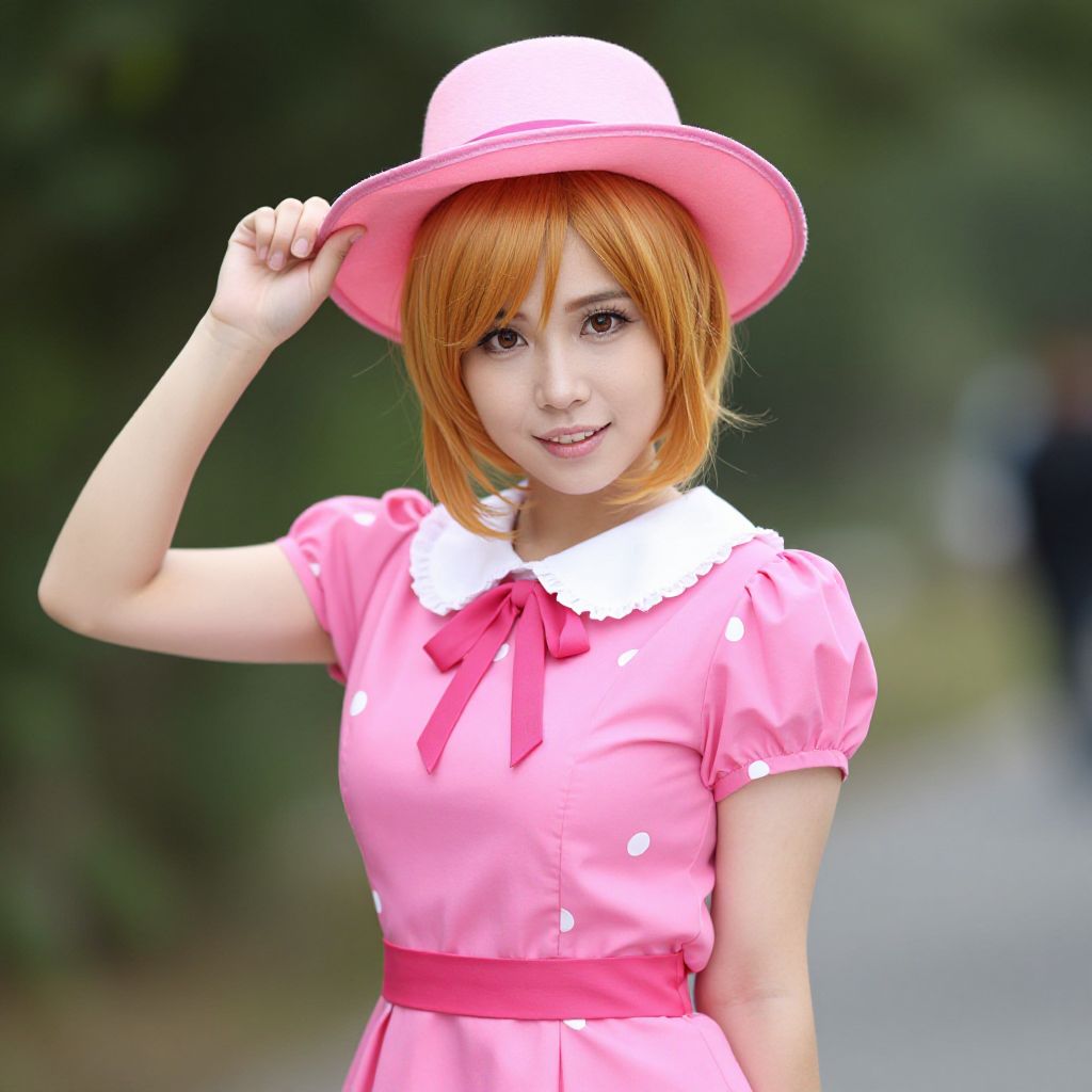 Photograph of an Asian woman with orange hair, wearing a pink dress with white polka dots, white collar, pink ribbon, and matching pink hat