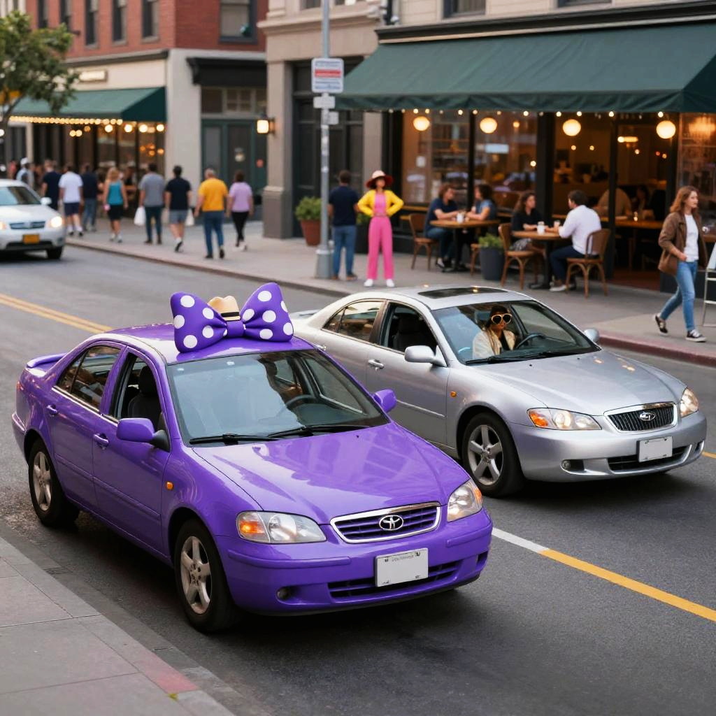 Realistic photo.Two live cars on the street in front of a bustling downtown area, a vibrant purple car wearing a polka dot bow and a sunhat, a sleek silver car in a leather jacket and aviator sunglasses, a lively downtown area with cafes, street performers, and bright lights, cartoon style digital art. realistic photo