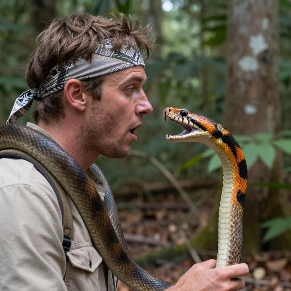 A photograph of a man and a large snake in a forest. The man, with short brown hair and a patterned headband, wears a beige shirt, facing the snake with an open mouth in surprise. The snake's head, with orange and black scales, is close to his face, mouth open. Dense green foliage and a tree trunk are in the background.
