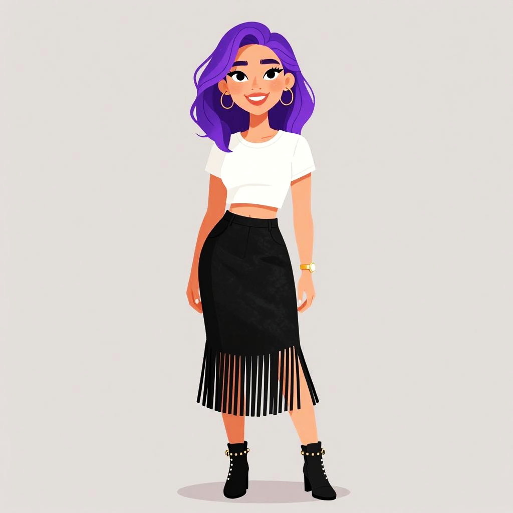 Digital illustration of a stylish woman with long purple hair, wearing a white dress, black tights, black boots, and holding a fringe bag, standing