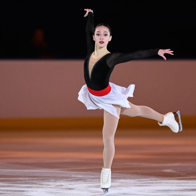 Photograph of an Asian female figure skater with fair skin and dark hair in an elegant updo. She wears a black, long-sleeved, V-neck leotard with sparkling details, a red waistband, and a white, flowing skirt. She is balancing on one leg, with her right leg extended back and left arm raised, while her right arm is extended sideways. She wears white figure skates with black blades. The background is dark with a blurred, reddish-brown wall, and the ice rink's surface is shiny and smooth. Her expression is focused and poised, capturing the grace and precision of her performance.